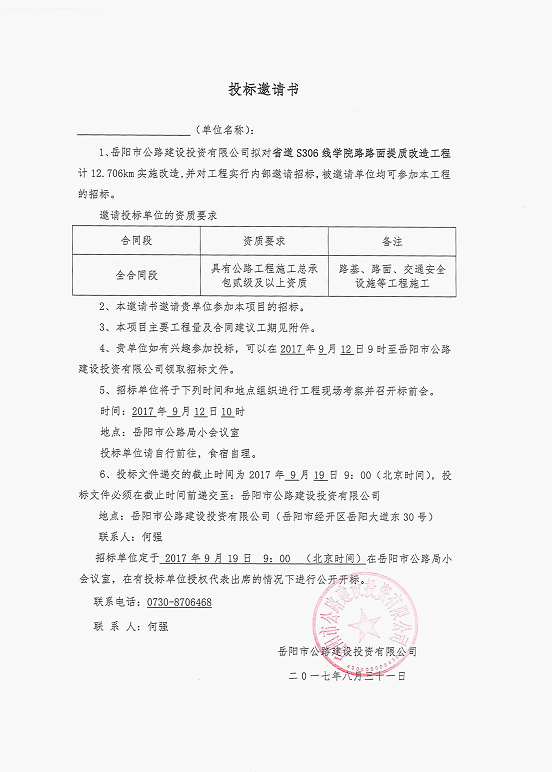 岳阳市公路建设投资有限公司拟对省道S306线学院路路面提质改造工程计12.706km实施公路提质改造,工程内容包括:路基、路面、交通安全设施等工程施工,并对工程实行内部邀请招标。