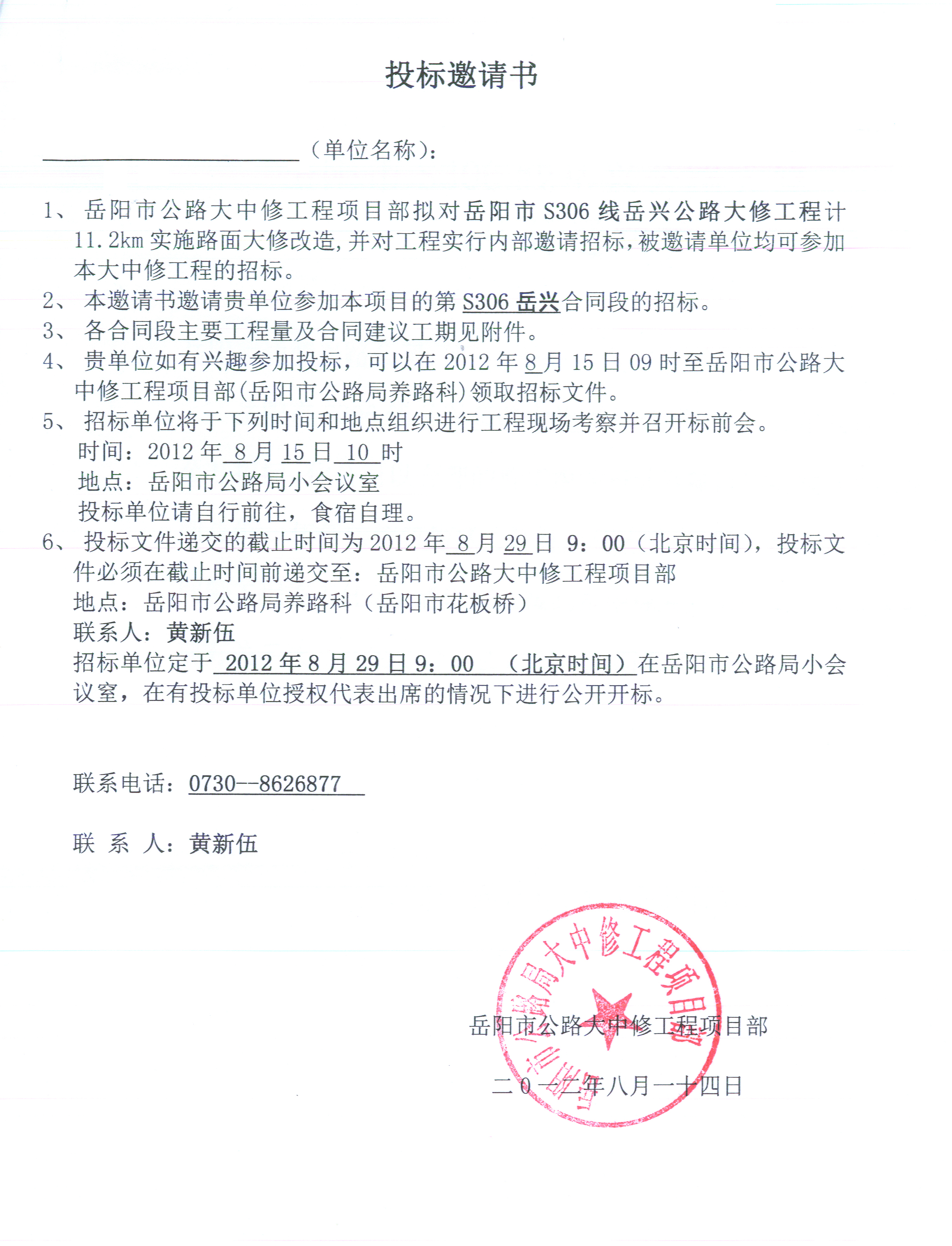 岳阳市公路大中修工程项目部拟对岳阳市S306线岳兴公路大修工程计11.2km实施路面大修改造,并对工程实行内部邀请招标。