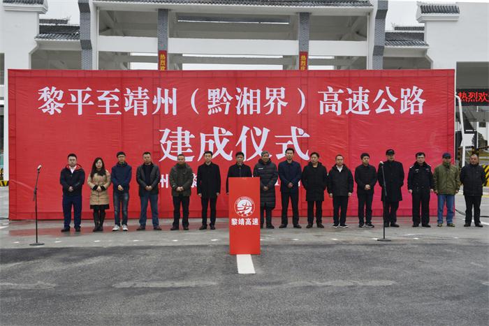 12月20日上午,黎靖高速公路建成仪式在高屯收费站举行。出席仪式的有:贵州省交通运输厅、贵州高速公路集团等行业主管部门领导,国家开发银行贵州省分行、中国银行贵州省分行、交通银行贵州省分行主要负责人,黔东南州、黎平县两级政府领导,以及黎靖公司、项目参建单位主要负责人。岳阳市公路建设和养护中心党委书记、主任彭旅京,党委委员、总工程师徐军,岳阳路桥党委书记、总经理黄河出席仪式,并亲切慰问黎靖高速建设管理团队。