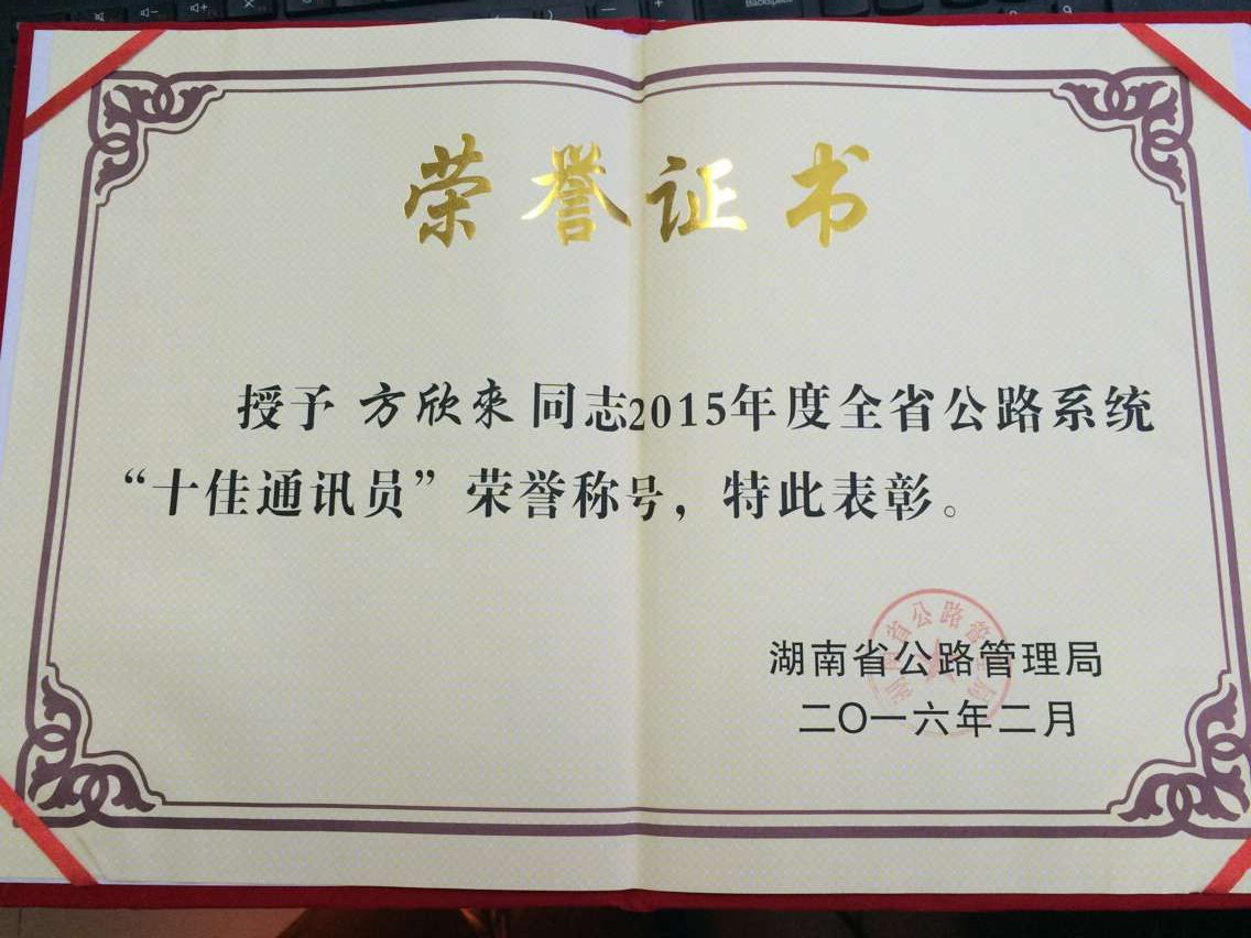 据了解,方欣来同志自2013年任办公室主任一职至今,工作上认真负责,勤奋练笔, 2015年度个人在《湖南公路》杂志发表文章3篇,《湖南省公路网》发表文章9篇,全年共计在各省、市媒体及我局网站发稿近30篇,获评岳阳市公路局“最佳”办事员、优秀通讯员。