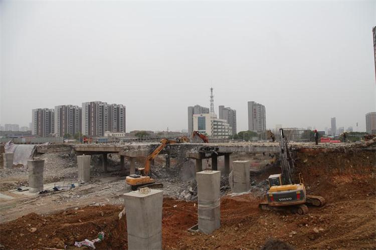 经过两天的紧张施工,今天中午,皇姑塘立交桥主线旧桥全部拆除。107国道太阳桥到皇姑塘立交段封闭,过往车辆需从这两处出匝道,经白石岭路、岳阳大道再上107国道,旧桥的北侧修筑了临时车道,武广高铁岳阳东站往返市区可有序通行。据现场负责人介绍,为确保现场交通安全畅通,项目部加大了人员投入,在匝道出入口及临时车道安排了多名安全员配合交警维护现场通行秩序,旧桥拆除后,新桥主线将于近期架设梁板,大约三个月即可恢复南北路段通行。