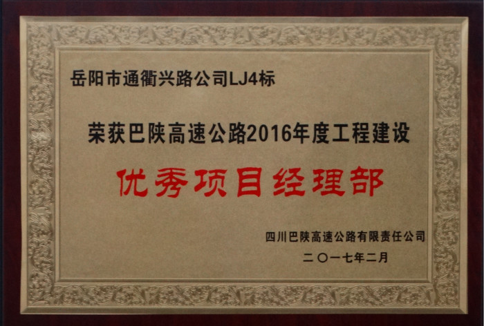 日前,通衢公司四川桃巴高速LJ4标项目部被业主巴陕公司评为“2016年度优秀项目经理部” ,项目负责人被评为“优秀项目经理”。