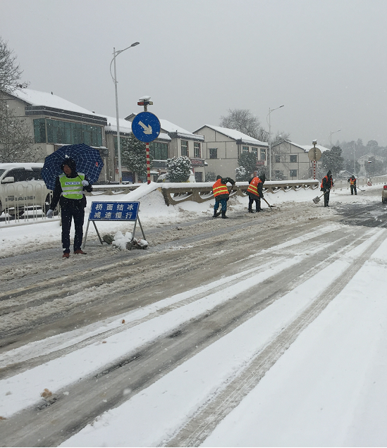 为应对低温雨雪冰冻天气,湘阴县公路建养中心加强保畅联络,及时收集气象信息,早部署、早安排,科学制订应急预案,成立抗冰抢险保畅队伍,有效应对突发险情。自26日至28日,已在各重要站点储备了融雪剂、防滑砂、麻袋、铁锹等应急物资,调配了铲车、融雪剂撒布机等机械设备待命;在各大中型桥梁和急弯、陡坡易结冰险要路段增设安全标志牌80多块。29日傍晚,天空飘起了小雪粒,湘阴县公路建养中心迅速组织抢险队伍连夜在湘阴湘江大桥、湘水桥、资水桥等大中型桥梁险要路段撒融雪剂,防止路面结冰。该中心全体工作人员取消元旦休假,实行24小时领导带班值守制度,对管养全线公路桥梁展开日夜不间断巡查,及时排除险情。
