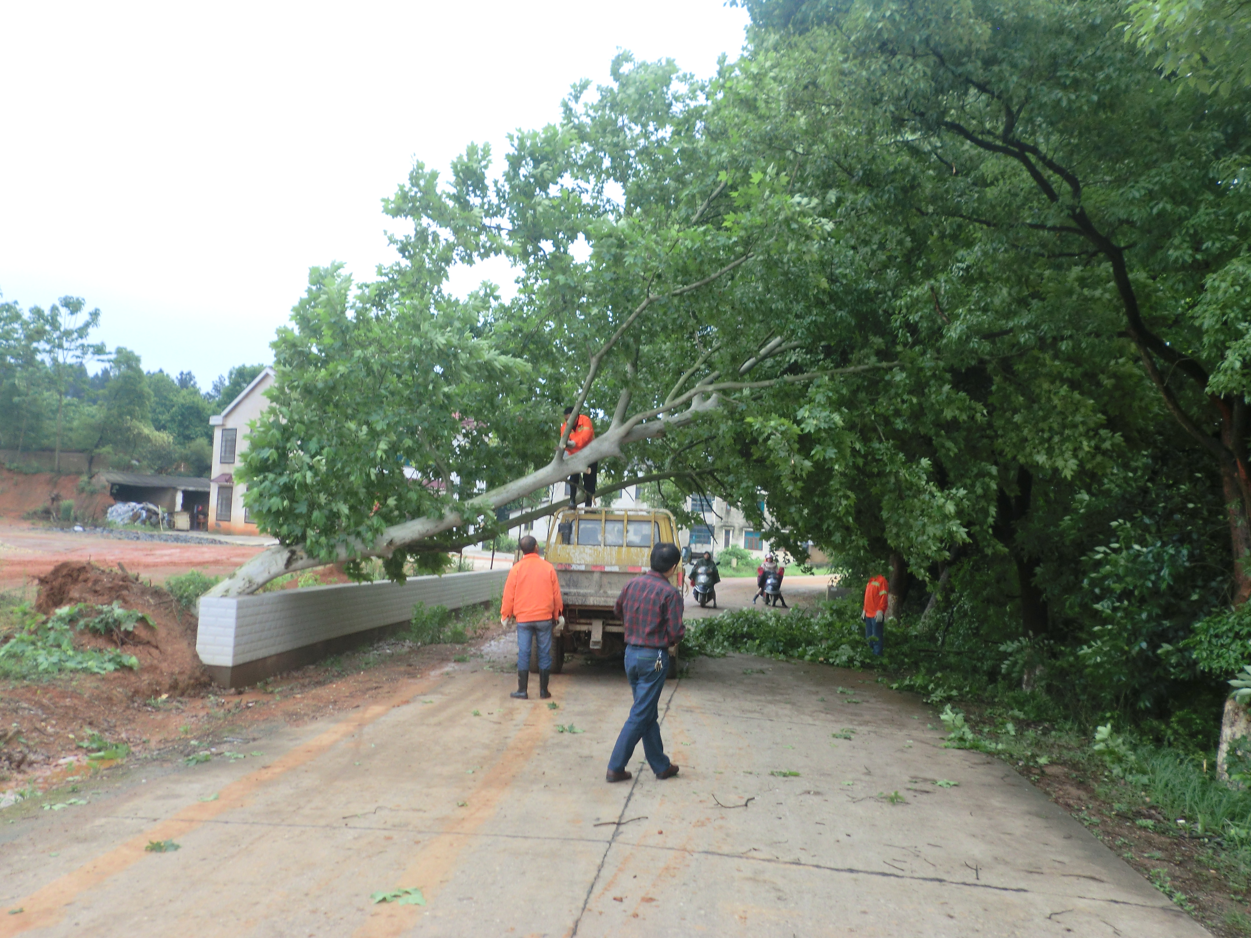 5月11日凌晨3点多狂风大作,雷电交加,汨罗局何协军副局长接到居民电话称新石线京古塘的一棵行道树由于雨大风急被大风刮倒,横在马路上,造成车辆通行困难。何局长闻讯紧急调动黄市公路站站员赶到现场,组织人员对倒地的行道树进行抢险清理。近日由于雷暴大风天气频繁,多次出现暴雨冲毁路面、狂风吹倒树木的现象,我局听闻险情,总是以最快的速度组织人员现场抢险,及时修复路面,清理倒伏树木,处置各类险情,确保了道路畅通和安全。