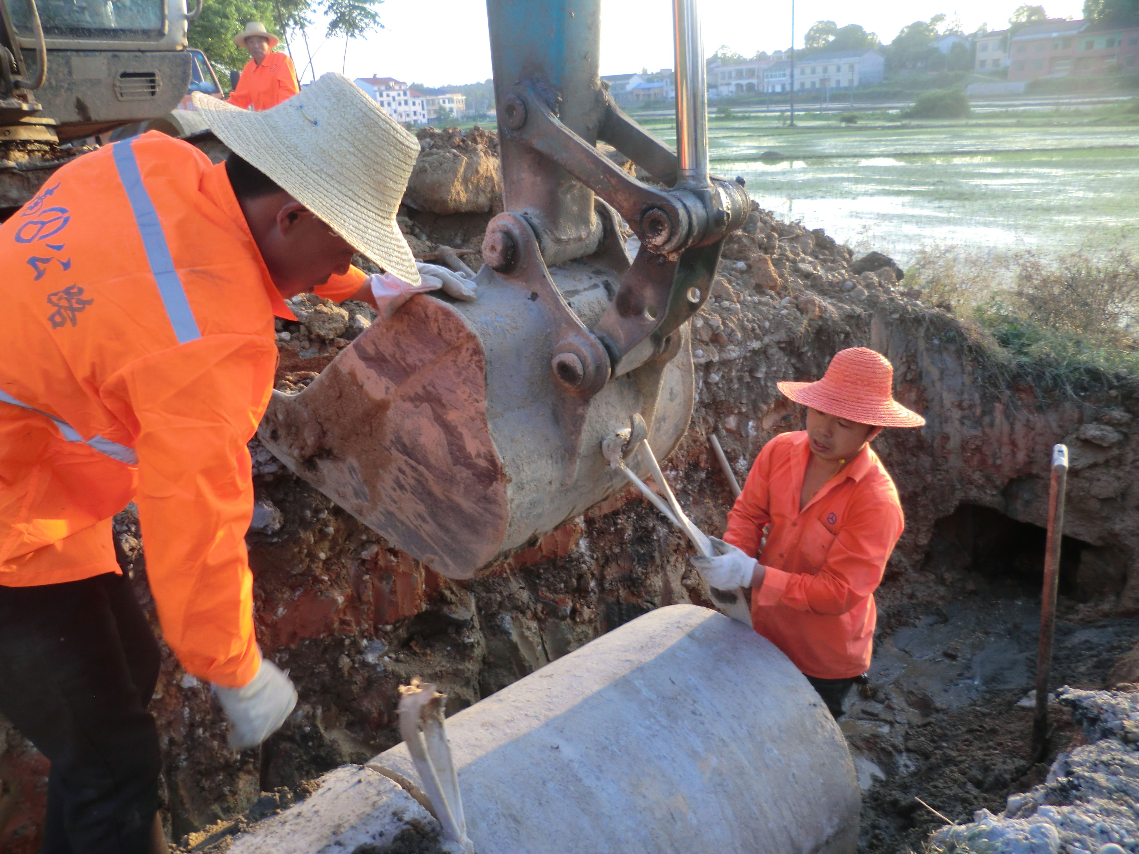 市郊站站长沈全新正在引导挖机吊涵管