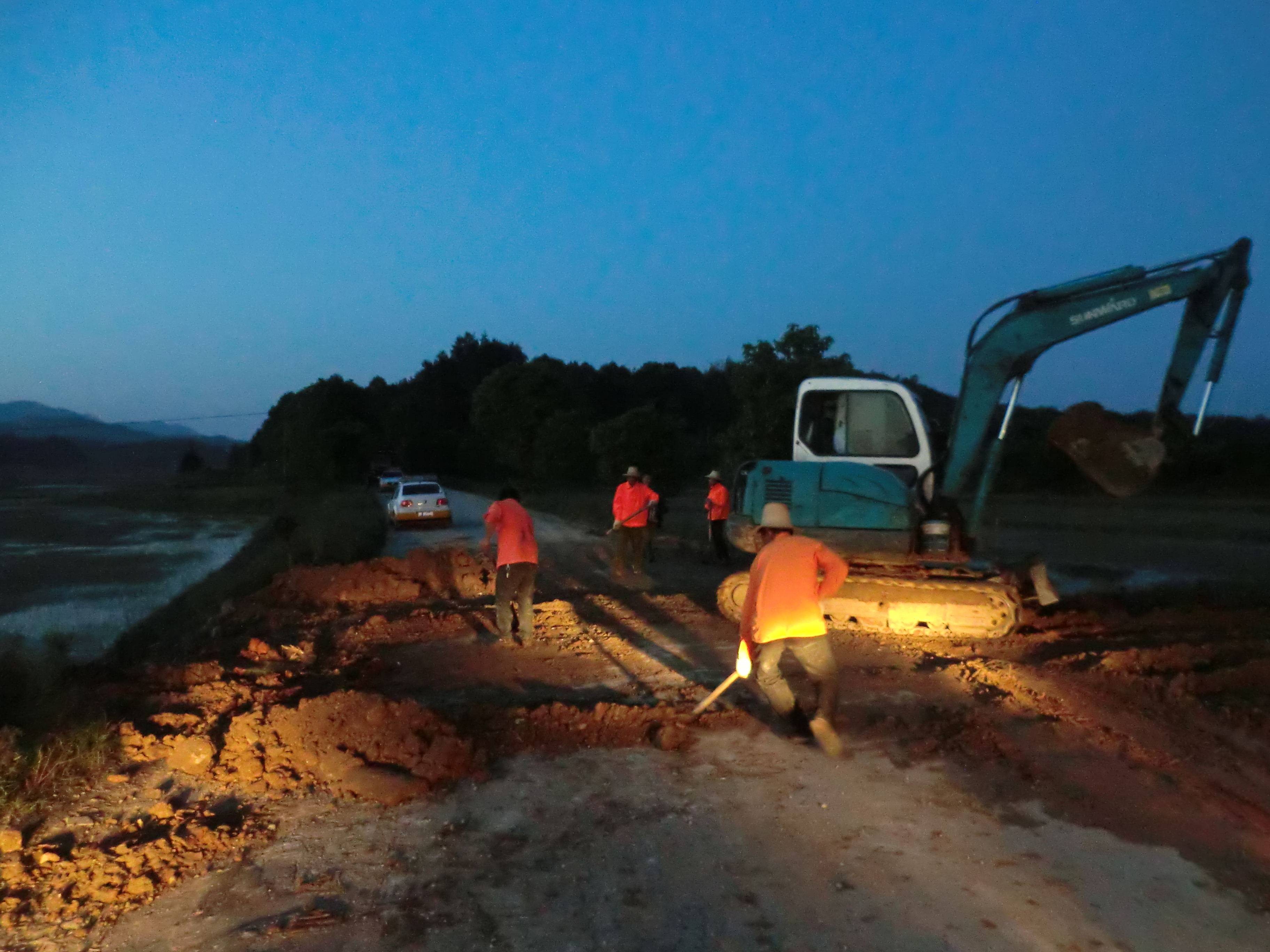 5月11日上午10点,一阵急促的铃声,让正在黄市巡路的副局长何协军感受了事件的紧急。原来由于连日暴雨浸蚀,张傲线12K+100一处路基塌陷,形成了一个直径近2米的大坑,存在严重的安全隐患。何协军同志与随车的技术员同志立马赶往现场。塌方已将涵洞出水口堵死,塌陷处涵洞已断成两截,再遇大雨将会中断交通。何局长当即决定不计代价迅速修复。不到2小时,1台挖机、1台夯机、3台农用车全部到位,市郊站6名站员,路政8名路政员也火速赶到。大家都明白,工程必须尽快完工,才能保证司机朋友们晚上的安全通行。大家劲往一处使,采取最优的施工方案,将原双∮20涵管改成∮80的涵管,彻底解决排水的问题。连晚饭都是在施工现场随便解决的。一直忙晚上11点所有的工程全部完成,同志们方才拖着极度疲乏的身体放心回到家中。本次水毁抢修共计用掉水泥3T,砂石1000多立方,总费用近2万元,均系我局自行垫资。