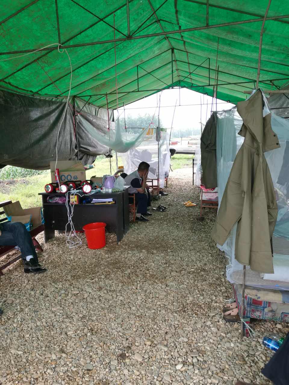 在驻守处,我们看到了驻守环境的简陋,蚊虫肆意乱飞,每餐就是简简单单的一盒盒饭,连上厕所洗澡都很不方便,并且一天24小时都要轮番对大堤进行检查,基本上连觉都睡不好。