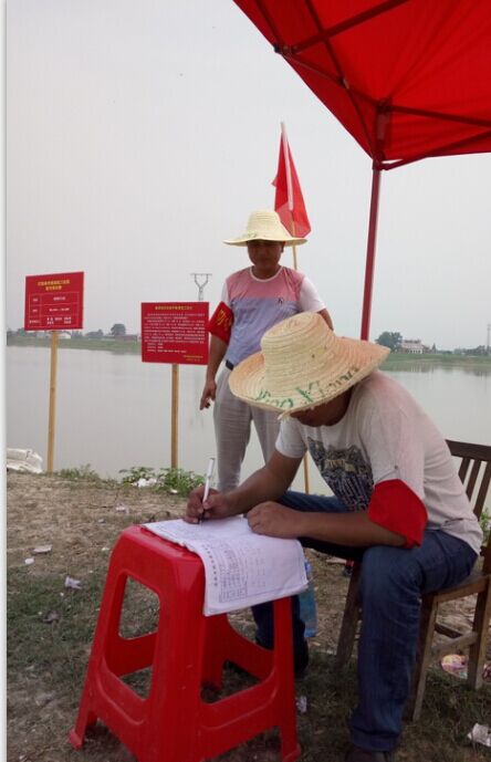 7月13日,在湘阴湘资垸的一线防洪大堤上,湘阴局职工周红正在认真地记录巡堤查险情况。市局抗洪分派小组和湘阴局干职工正共同坚守抗洪大堤,查险排险,共保湘阴安全度汛。