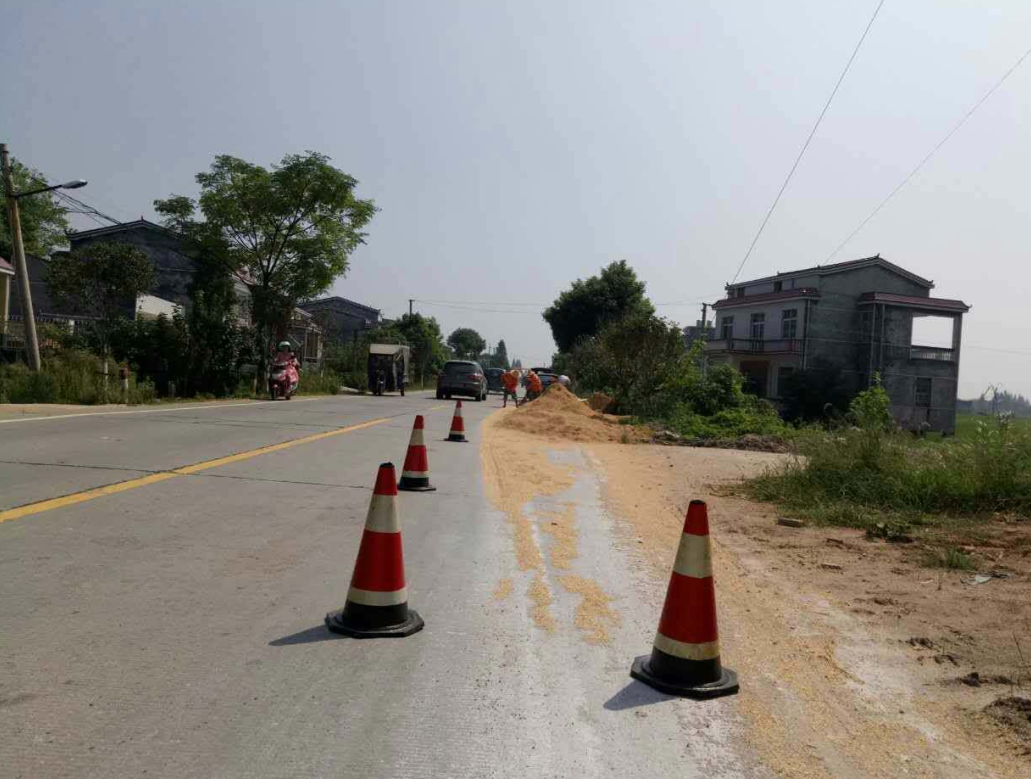 接到举报电话半小时后到达现场,工作人员发现撒落在路面上的零碎谷壳占满半边车道长约200米,还有压缩成捆高约1米多、重约500斤的谷壳堆6个,工作人员立即设置安全标志,进行清扫,并将成捆的谷壳堆慢慢推移至路边,再组织吊车进行移除,经过2个小时的作业,公路恢复正常畅通。