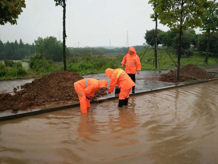养护人员清理排水通道,排除路面积水
