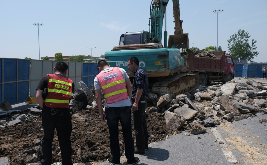 据了解,该地点路面由于杭瑞高速君山收费站开通后,车流量剧增,导致路面破损严重,君山公路局在得到君山区委区政府指示后,立即对该地点进行路面抢修作业。现场负责人介绍到该工程将有约三百多平米的路面被挖开,纵深约80公分,在将原有破损路面和路基全部清除干净后,直接铺装三层混凝土,保证路基的长效稳固,最后还将铺上沥青混凝土。工程量虽然不大,但是君山公路局现场施工人员们争分夺秒,以确保最短时间里能恢复道路通行能力,将整个工期最大限度的缩短在10天左右。
