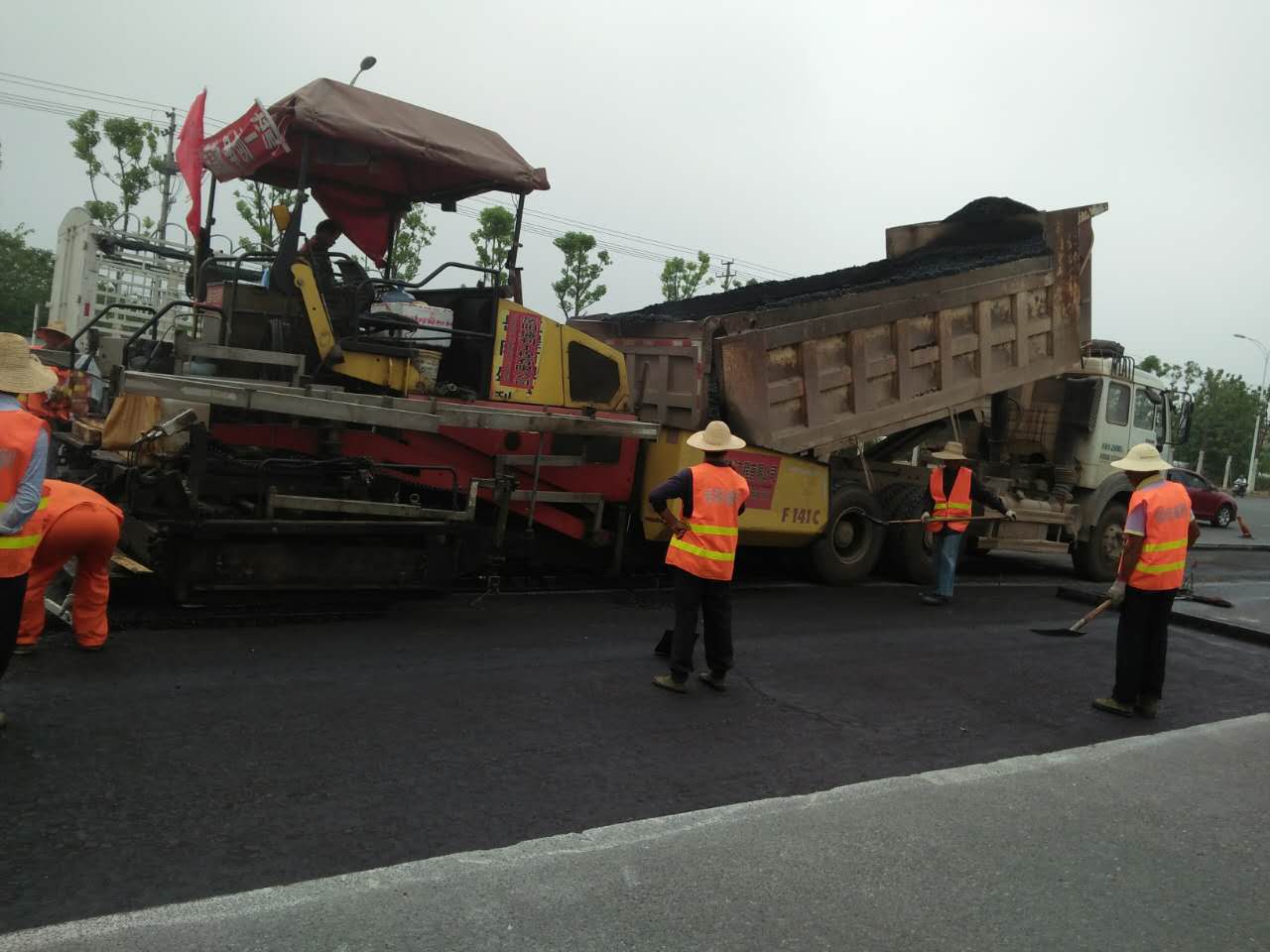 养护工人冒酷暑进行沥青路面摊铺