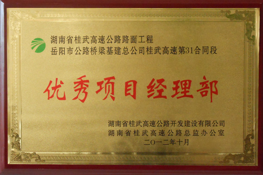 2012年10月15日,随着桂武公司举办的最后一次桂武高速全线施工单位考核评比的落幕,岳阳路桥桂武31标再一次获得A类施工单位荣誉称号并以五次评比全A的成绩结束了路面工程合同内全部施工任务。