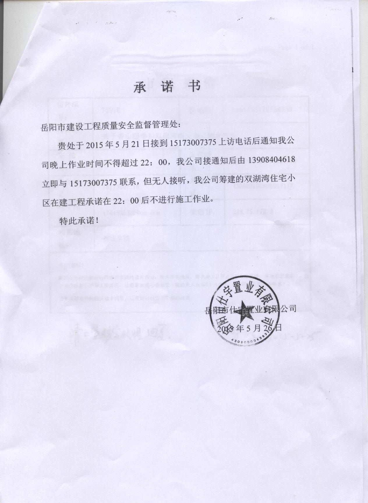 | 回复内容: | “psu7338”同志: 您好!您的来信收悉,现回复如下: 经我局监督机构市建设工程质量安全监督处现场调查,香山四季项目主体已完工,正在进行绿化作业,没有噪声扰民问题。双湖湾项目主体正在施工,针对施工噪声问题,我们已要求开发商作出书面承诺,严格控制作业时间。同时,要求开发商与您联系进行沟通,开发商多次拨打您的电话均无人接听。市建设工程质量安全监督处工作人员也多次拨打您的电话,也无法接通。鉴于该情况,请您收到我们的回复后,共同参与监督,若发现开发商违反承诺现象,请及时与市建设工程质量安全监督处联系,地址:巴陵东路市住建局北院5楼。 特此回复。 岳阳市住房和城乡建设局 2015年5月27日