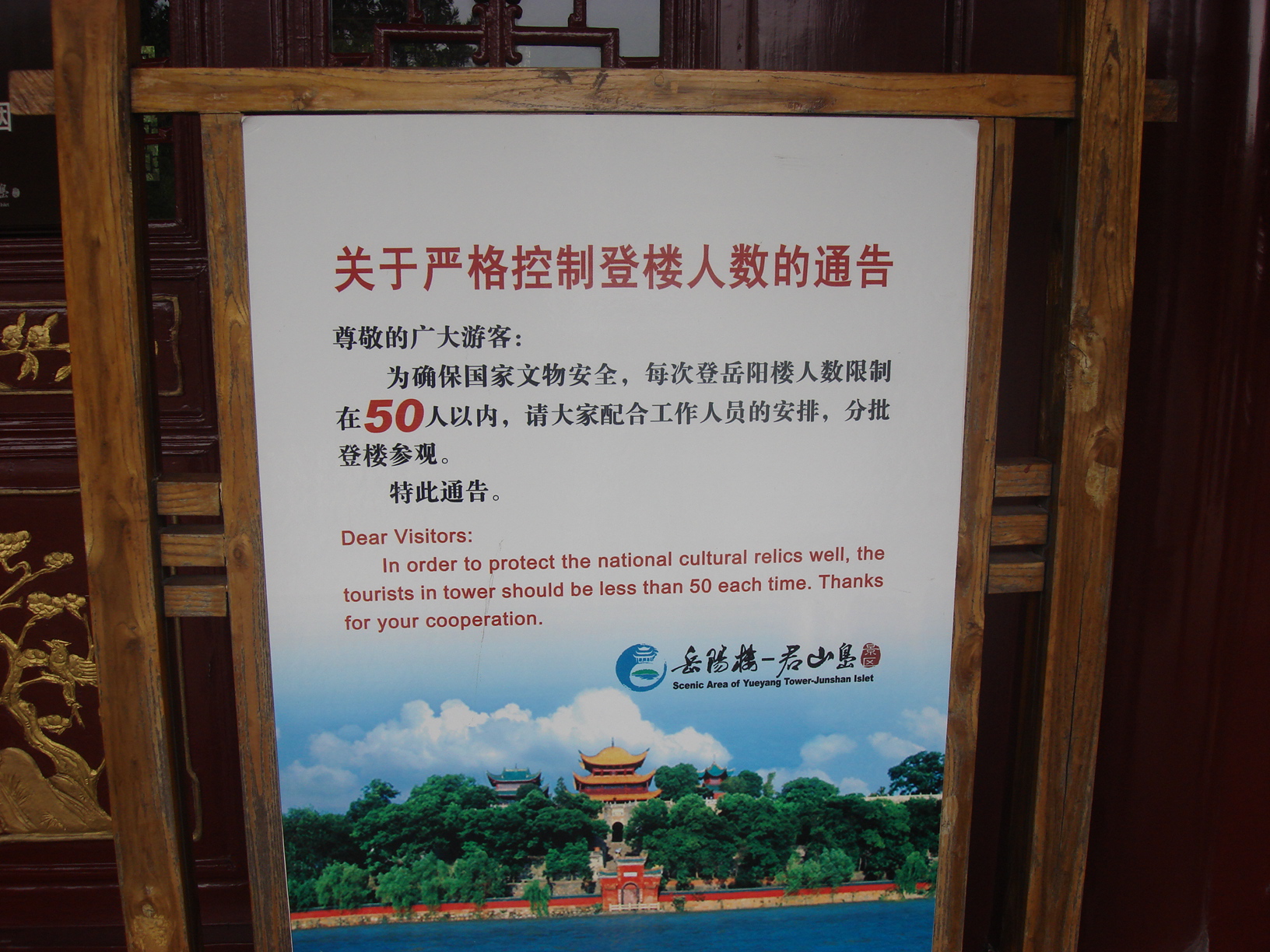 十月份,我是作为一名散客去的岳阳楼,在参观期间,陆陆续续地来了很多旅游团队,明明楼下有个牌子,写着:“……每次登岳阳楼的人数限制在50人以内……”但不见有工作人员把关,以至于人数大大超出,每当有几个旅行团一起拥来的时候,二楼三楼之上,每层都不止50人,严重超载了。希望这一点,公园方面要尽快改正过来。岳阳楼是江南三大名楼之中的唯一古建筑,实属难得!不要毁于我们这一代人的手中啊,要对得起祖先,也要对得起后代!让它永远都传承下去吧!