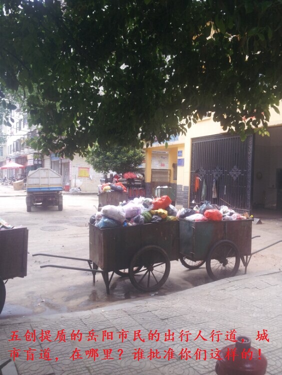 该中转站位于东西主干道边,每逢垃圾中转时段,自卸式机动垃圾车来此进行垃圾清运,小的人力垃圾车从四面八方汇聚于此倾泻转运垃圾,每到此时对于非机动车道上的自行车及路上的行人都造成的了出行的影响,由于人行道被机动垃圾车完全截断,所以行人只能走机动车道,因此而埋下了交通安全隐患,此处多年来多次发生行人摔倒、被自行车、电动车撞倒而受伤的交通安全事故。特别是该垃圾站门口的一个便于自卸垃圾车清运的斜坡路完全阻断了该人行道上的一条盲道,《残疾人保障法》第四十六条规定:“国家和社会逐步实行方便残疾人的城市道路和建筑物设计规范,采取无障碍措施。”《道路交通安全法》第三十四条第二款也规定:“城市主要道路的人行道,应当按照规划设置盲道。盲道的设置应当符合国家标准。”此处完全阻断盲道的行为与《残疾人保障法》等相关政策法规背道而驰,极大的损害了残疾人的合法权益。