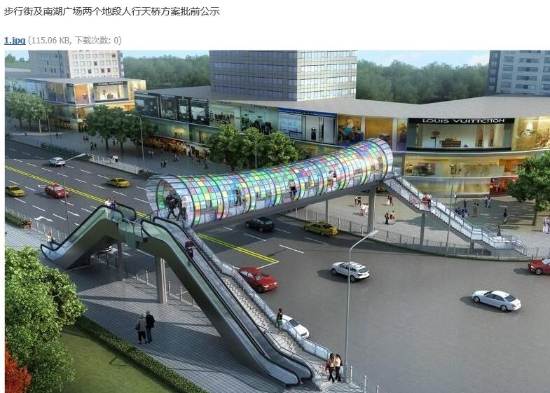 谢谢您百忙中查阅此信。本人在红网论坛看到某岳阳网民发布的“步行街及南湖广场两个地段人行天桥方案批前公示”帖,其中写明了地点是在东茅岭步行街和南湖广场附近准备建天桥的规划,相关图照见附件,从效果图上看此天桥都建了上下扶梯及多色过道顶棚,看上去还是不错的。