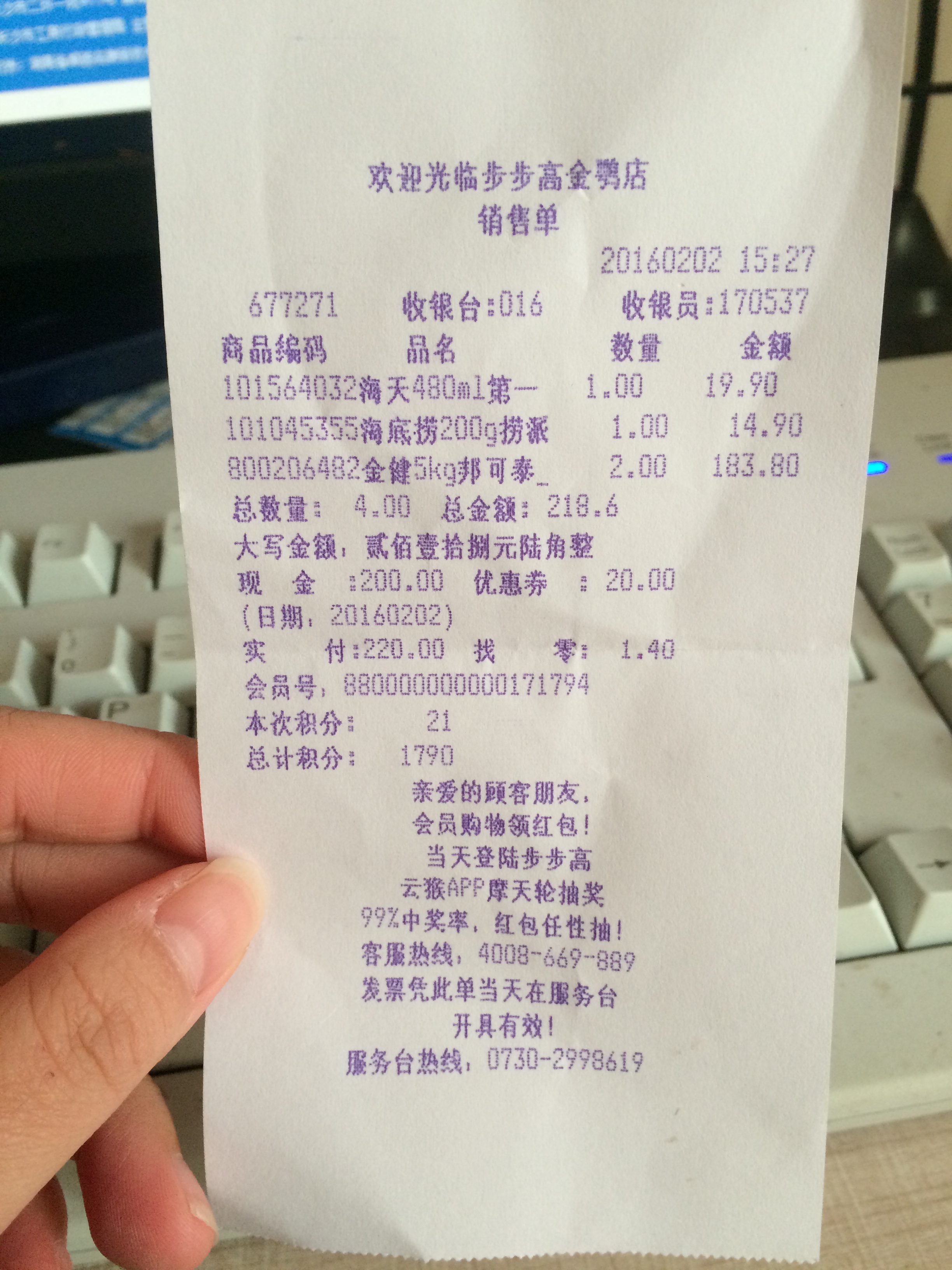 这家超市的米的货架上有种商品为金健邦可泰大米5KG装,货架上的促销牌说明了邦可泰的大米第二件8折,但是在柜台结账时,第二件未8折,收银员向相关负责人打电话询问,负责人也反复询问了是不是邦可泰。但是不知什么原因,最后收银员的回复是打8折的商品已断货,货架上的邦可泰乌汶府大米没有第二件8折,是另外一种叫金泰的大米才有优惠。