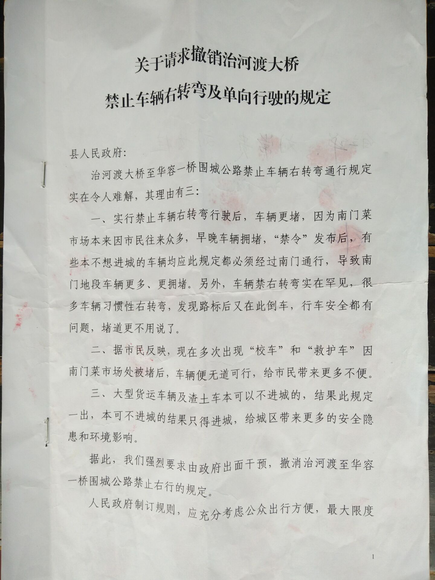 如果华容县政府及领导下的相关部门真正想缓解交通压力,我们建议:两城之间围城公路可按一级公路扩宽,保证道路畅通,县政府:此事我们本地居民、华泰客运公司及治河渡镇政府已向交警部门多次反映无果,此次我们特联名相关人员向市政府提出“关于请求撤销华容县治河渡大桥禁止车辆右转弯及单向行驶的规定的申请”,如果没有满意答复,我们将保留进一步反映的权利。