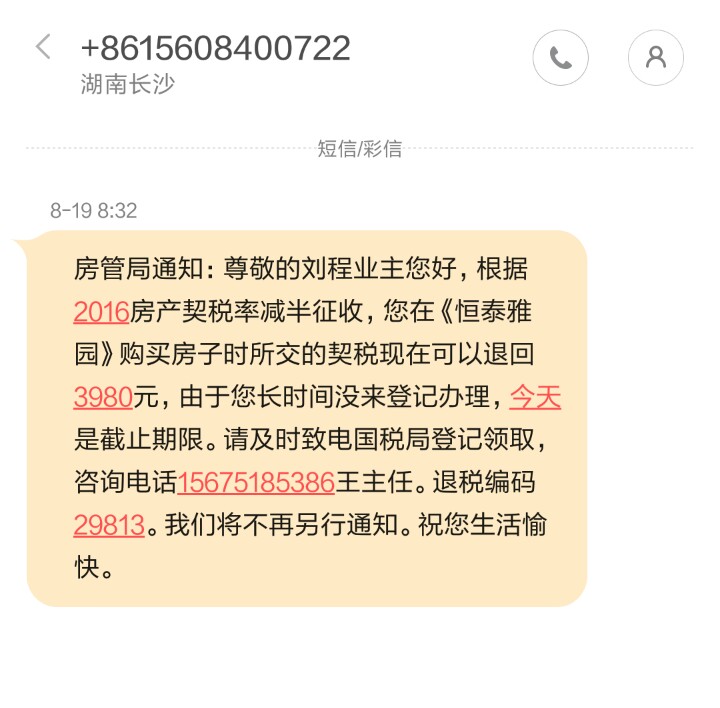 您收到的短信为电信诈骗信息,契税由地税部门征管,不属国税部门征收,且地税部门不会以私人手机号码短信通知的形式发送涉税信息,请勿上当。如您对涉税事宜有疑问,为了您更快获得解答,欢迎致电12366热线咨询。