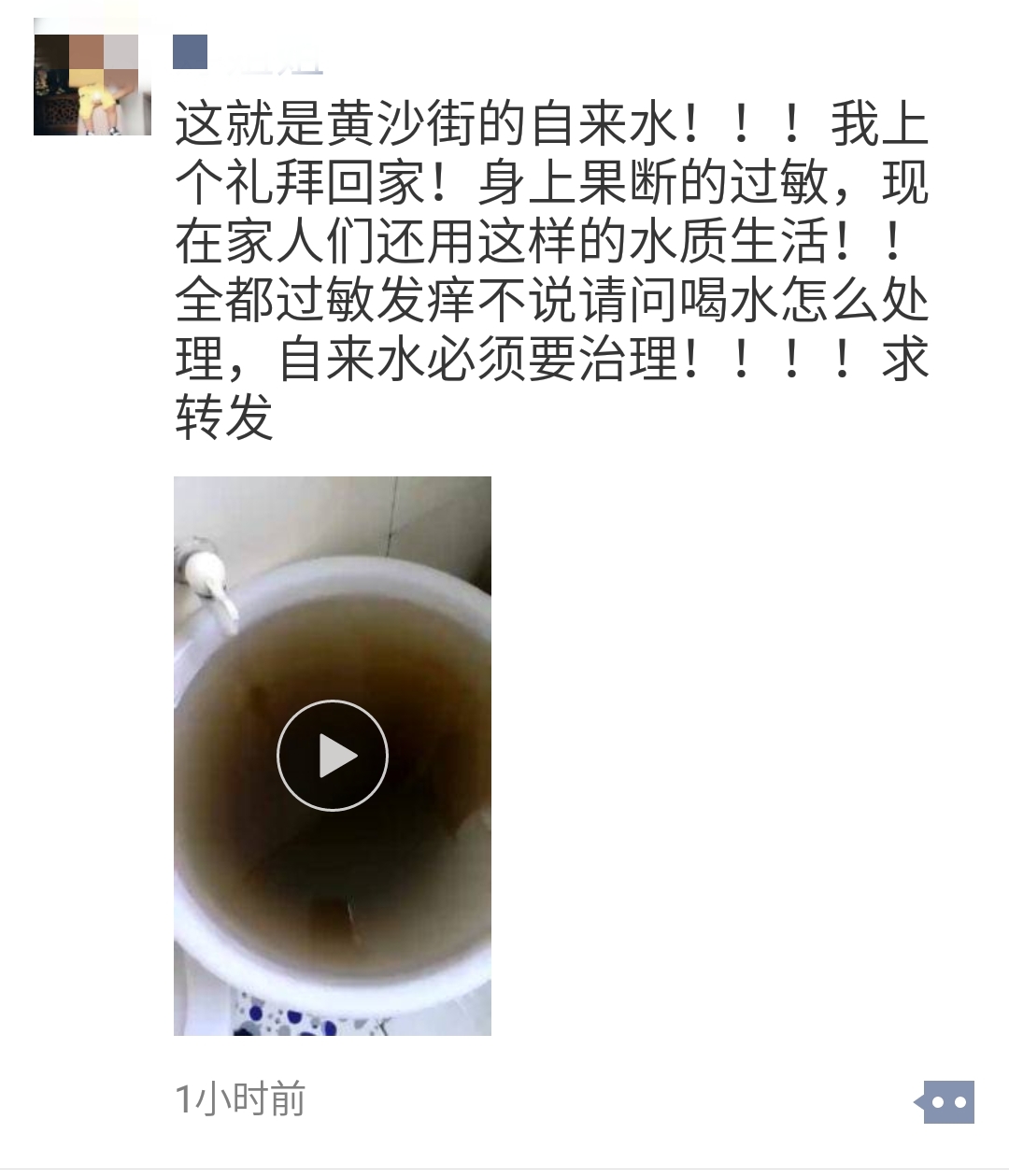 近来岳阳县黄沙街镇自来水水质突然下降,水不仅发黑,有泥,更是有一股腥臭味,喝水只能挑水上楼,洗澡便全身过敏,生活难以继续,希望您能帮助我们!