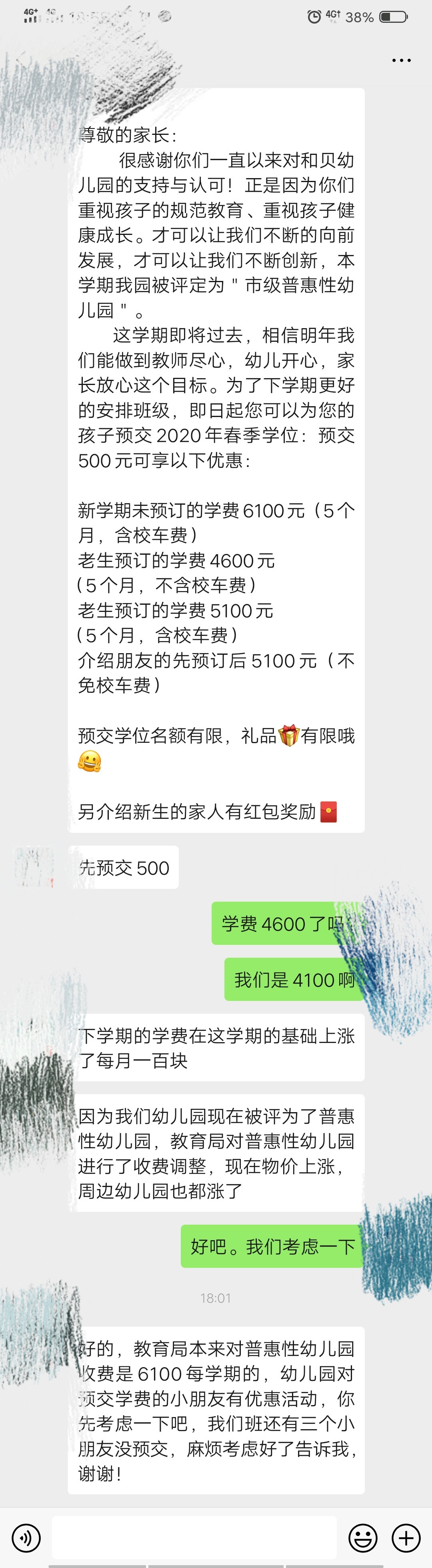 | 内容: | 您好,我的小孩今年9月份就读于岳阳市八字门黎家垅路6号白象食品对面(和贝情境幼儿园),今年9月份入园时学费4100元/学期(不包含车费)一学期为5个月。本月接到老师通知预交下学期学费,4600元/学期(不包含车费),就学费上涨500元/学期,和幼儿园老师以及幼儿园负责人沟通,幼儿园给出回复,该幼儿园被评为普惠性幼儿园,教育局本来对普惠性幼儿园收费是6100每学期。疑问:普惠性幼儿园不是应该更加优惠吗?为何学费还会涨?在教育局公布的2018年至2020年普惠性幼儿园评比里面也没有看到和贝情境幼儿园。请问这样的涨价合理吗?不合理该怎么制止? |